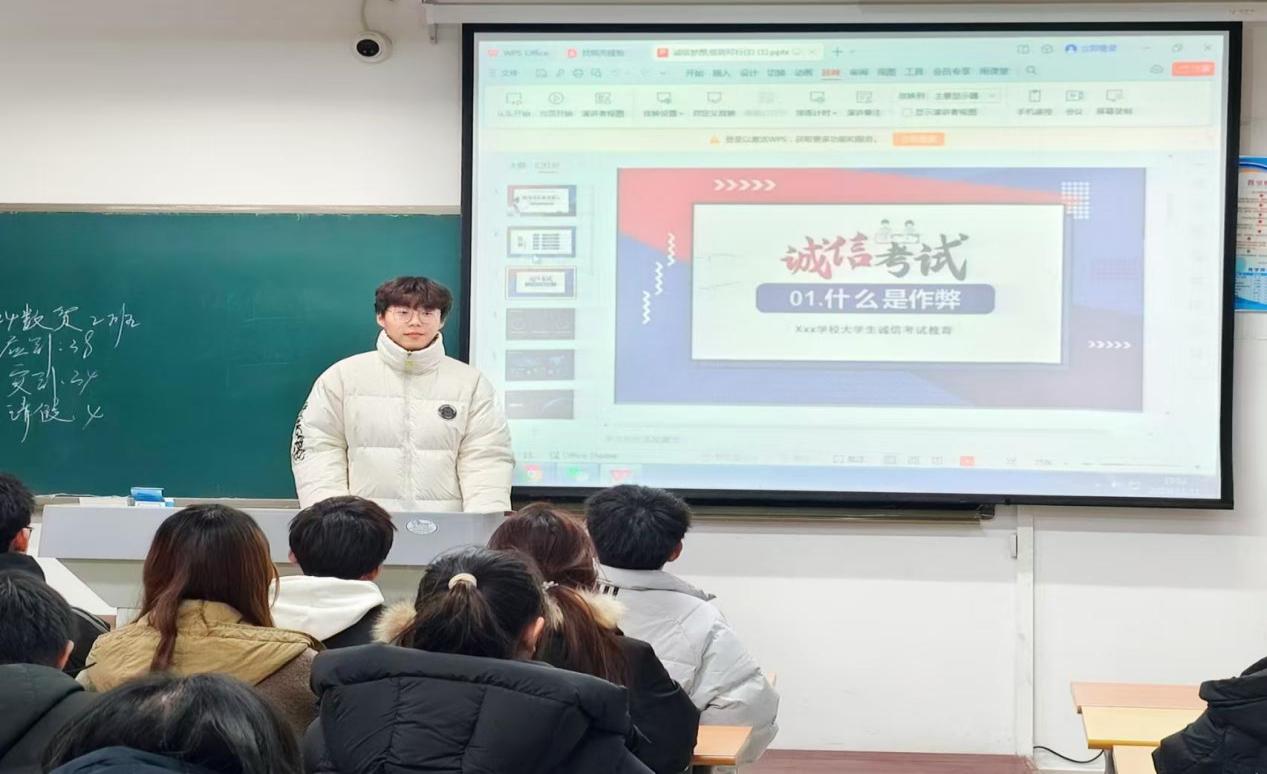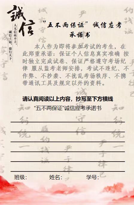 旨在以考风促学风,有效引导和规范学生的思想和行为,从而进一步促进学风考风建设,活动在各班班长的带领下开展严肃考风考纪主题班会,对班级同学强调端正考风、严肃考纪、文明答题、诚信应考,通过实际案例让同学们认识到违背诚信考试带来的严重后果,更加深刻地理解诚信对于个人品质塑造的重要性。“纸上得来终觉浅,绝知此事要躬行。”为营造出班级内以诚信为荣的氛围,发挥同学们的主观能动性,各班级以宿舍为单位,由舍长带头宣誓,签署考前诚信考试承诺书。考试承诺书的签订进一步强调了诚信考试的重要性,激励同学们在考试中坚守诚信底线,认真对待学习和考试,提升学习的积极性和主动性。
