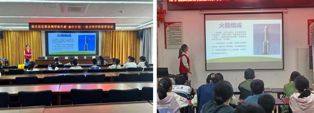 在崇文社区,科创协会社团和а 天堂 在线学生会成员借助PPT、视频、图画及手工实践等多种形式,循序渐进地为孩子们揭开火箭的神秘面纱。从火箭独特的外形设计讲起,用“鱼儿游水”的比喻解释流线型构造的科学原理;深入剖析火箭飞天动力来源时,将复杂的物理原理转化为通俗易懂的知识。主讲人现场示范火箭制作,步骤讲解细致入微。动手制作环节,现场气氛热烈非凡,志愿者们穿梭其中,悉心指导。此次活动不仅让孩子们收获航天知识,更激发了他们对科学探索的无限热情。