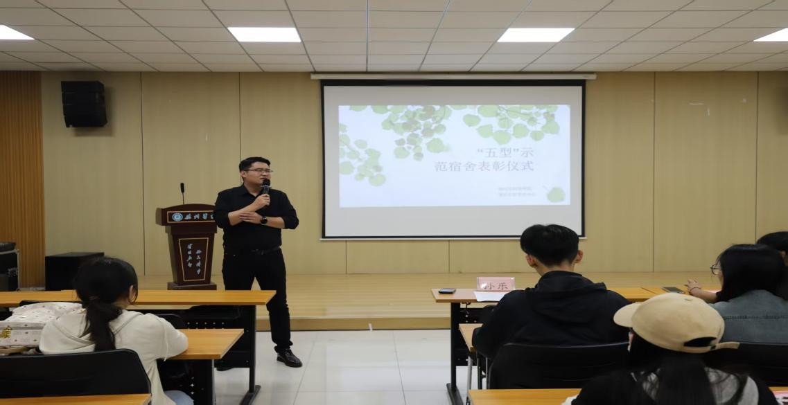 随后,郭艳君同学代表优秀宿舍上台发言。她代表全体舍友就秉持携手创建文明宿舍,齐心共筑温馨家园的理念进行全面阐述,倡导全体同学互助互利,携手共创“五型”宿舍新标杆。接下来,孙乐老师为优秀宿舍代表颁发荣誉证书。最后,孙乐老师强调宿舍是学校育人工作的重要一环,期望“五型”宿舍以思想引领方向,用行动诠释榜样,鼓励同学们共筑文明宿舍,不断提升自身综合素质,共同推动“五型”宿舍持续发展,携手营造温馨、和谐、安全的校园环境。