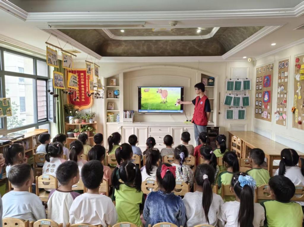 活动伊始,欢快的爱国动画短片《那年那兔那些事儿》精彩放映,孩子们在沉浸式的视听体验中感受家国情怀与团结一致的精神。随后,志愿者通过生动讲述雨来、王二小等小英雄故事,以及草原英雄小姐妹等体现民族团结的感人故事,配合图片道具与互动提问,让孩子们在聆听中感悟爱国精神与民族团结的力量;借助国旗、国徽知识宣讲与问答竞赛,以小奖品激发参与热情,深化对国家象征的认知;带领孩子们制作五星红旗、天安门等手工,在动手实践中强化爱国情怀。一系列寓教于乐的环节,让爱国和团结从抽象概念变为少年们可感、可参与的成长养分。