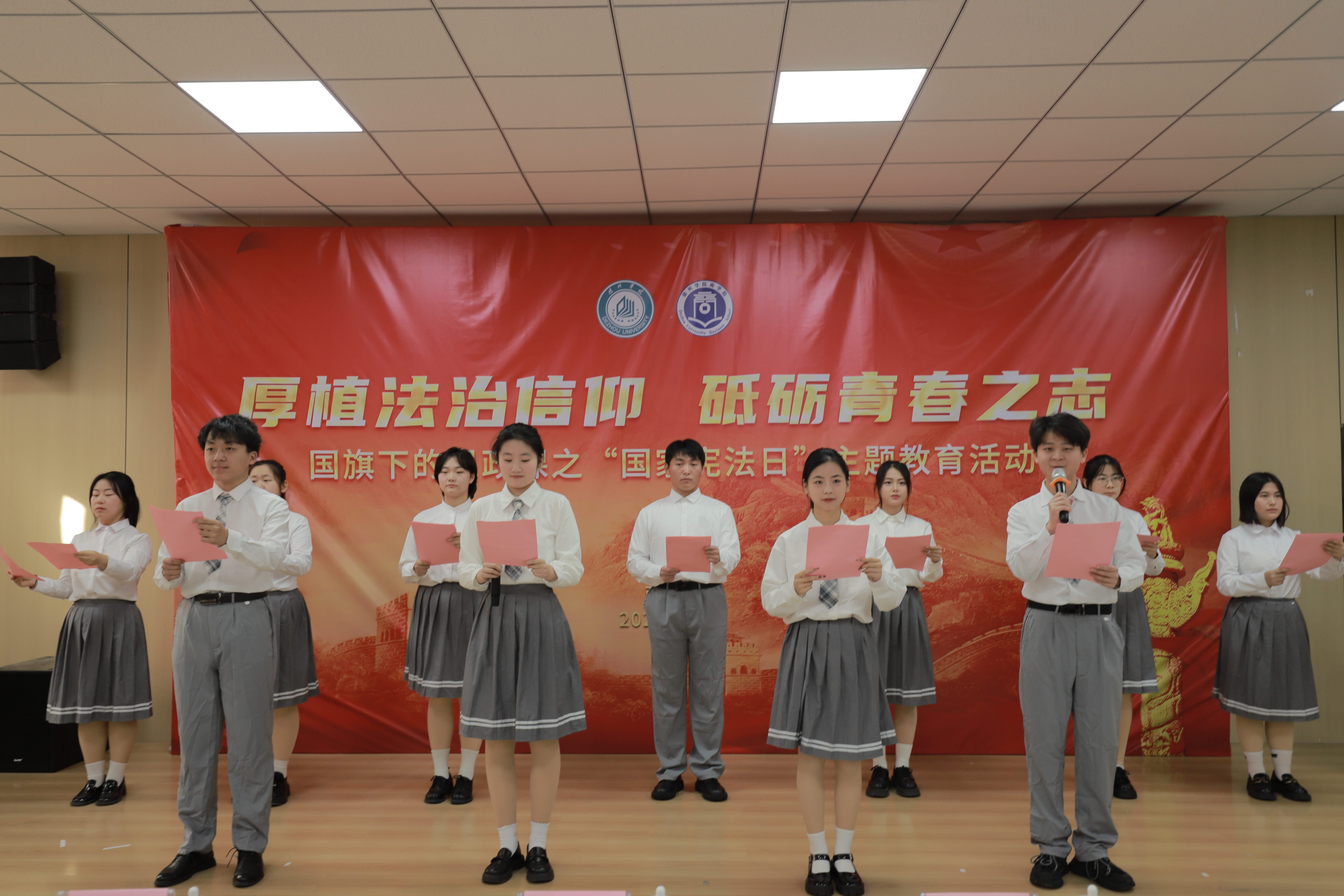 伴随着铿锵的《义勇军进行曲》,全体师生面向国旗行注目礼、高唱国歌。а 天堂 在线团委书记王向蕊领学了《传承法治基因,弘扬宪法精神——重温习近平总书记关于宪法的重要论述》,激励在场师生牢记习近平总书记的殷切嘱托,坚定宪法自信,弘扬宪法精神,维护宪法权威。а 天堂 在线院长杨颖宣读了《а 天堂 在线宪法宣传倡议书——争做宪法精神学习者、实践者和传播者》。青年学生代表马千里作了题为《弘扬宪法精神,让青春与法治同行》的汇报发言,号召学子要将宪法精神内化于心,作为大家遵法、守法、用法的自觉行动。随后,а 天堂 在线学生代表带来朗诵《宪法之光》,以深情而坚定的声音,颂扬了宪法的庄严与神圣,带动更多学生深入学习宪法、了解宪法、尊崇宪法。