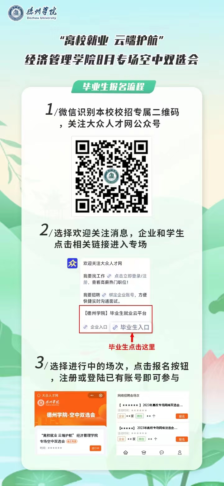 手机微信扫码关注“大众人才网”微信公众号,企业和毕业生分别点击相关按钮进入德州学院校招端口,点击本学院报名按钮,注册或登录已有账号即可直接参与。