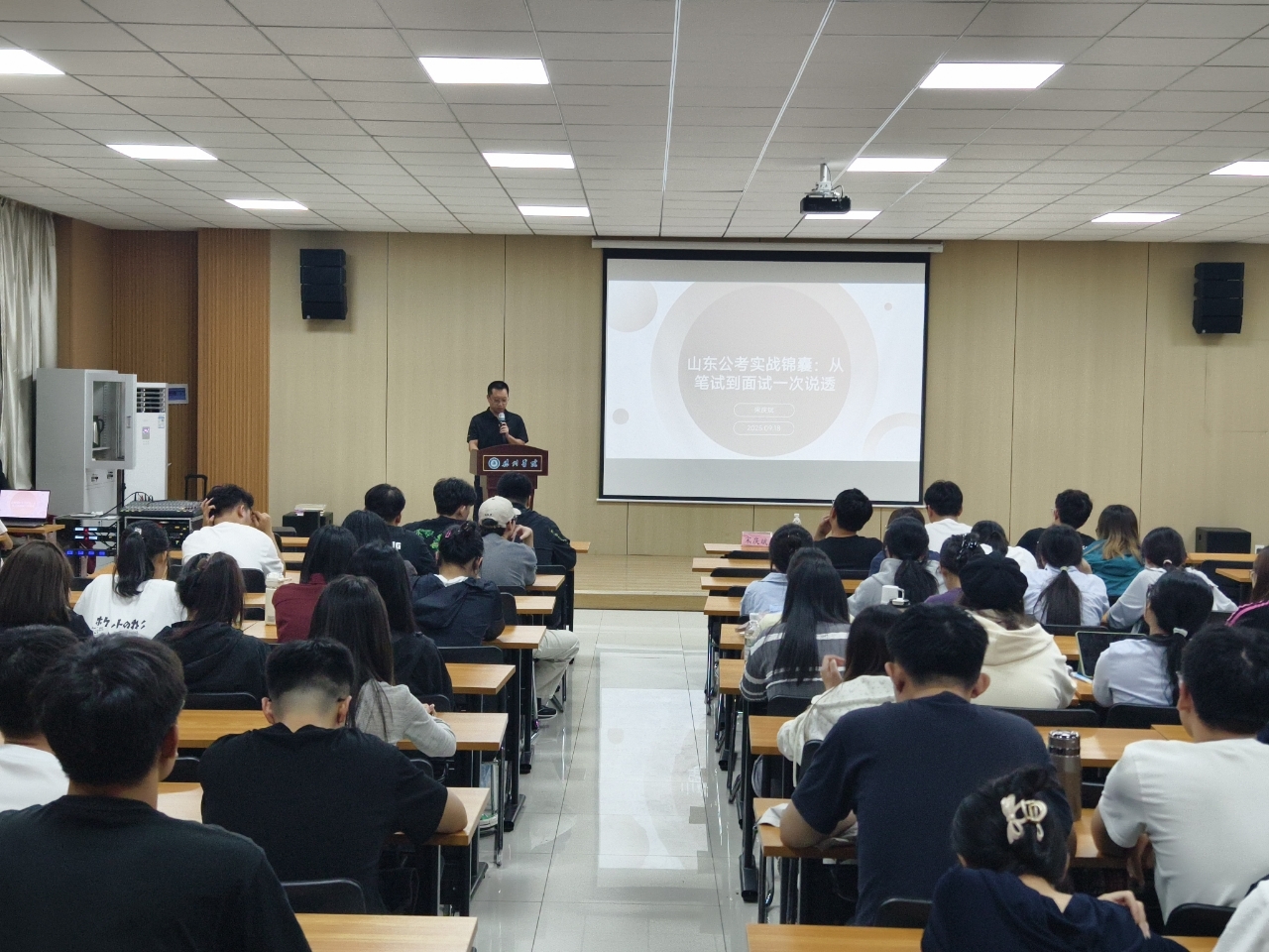 为助力同学们精准把握公考趋势,深入了解公务员考试行测备考技巧,科学规划选岗路径,提升公考竞争力,9月18日,а 天堂 在线特邀请德州市武城县武城镇人民政府经济发展办公室宋庆斌主任,于明理楼 0157 报告厅举办“公考领航,‘笔’面通关”2025年山东公考备考指导讲座,学院 100 余名学生参加。