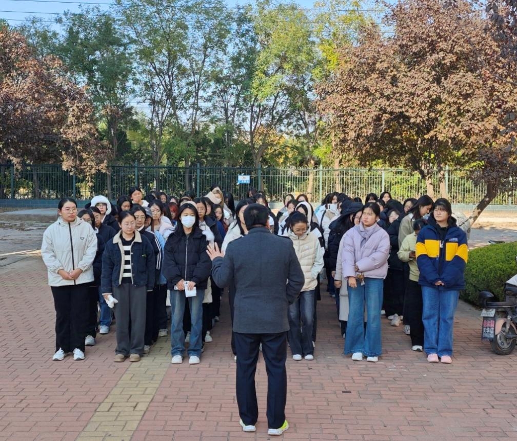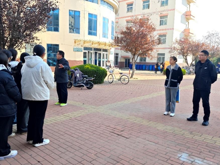 一阵急促哨声响起!消防应急疏散演练活动正式开启。同学们用湿毛巾捂住口鼻迅速行动起来,她们快速而有序地按照预定疏散路线进行撤离。在撤离过程中,展现出了良好的应急反应能力。参加演练的全体师生在极短的时间内便集中到18号楼门前,组织人员也第一时间进行人数清点,并及时汇报参演情况,整个演练过程高效且有序。