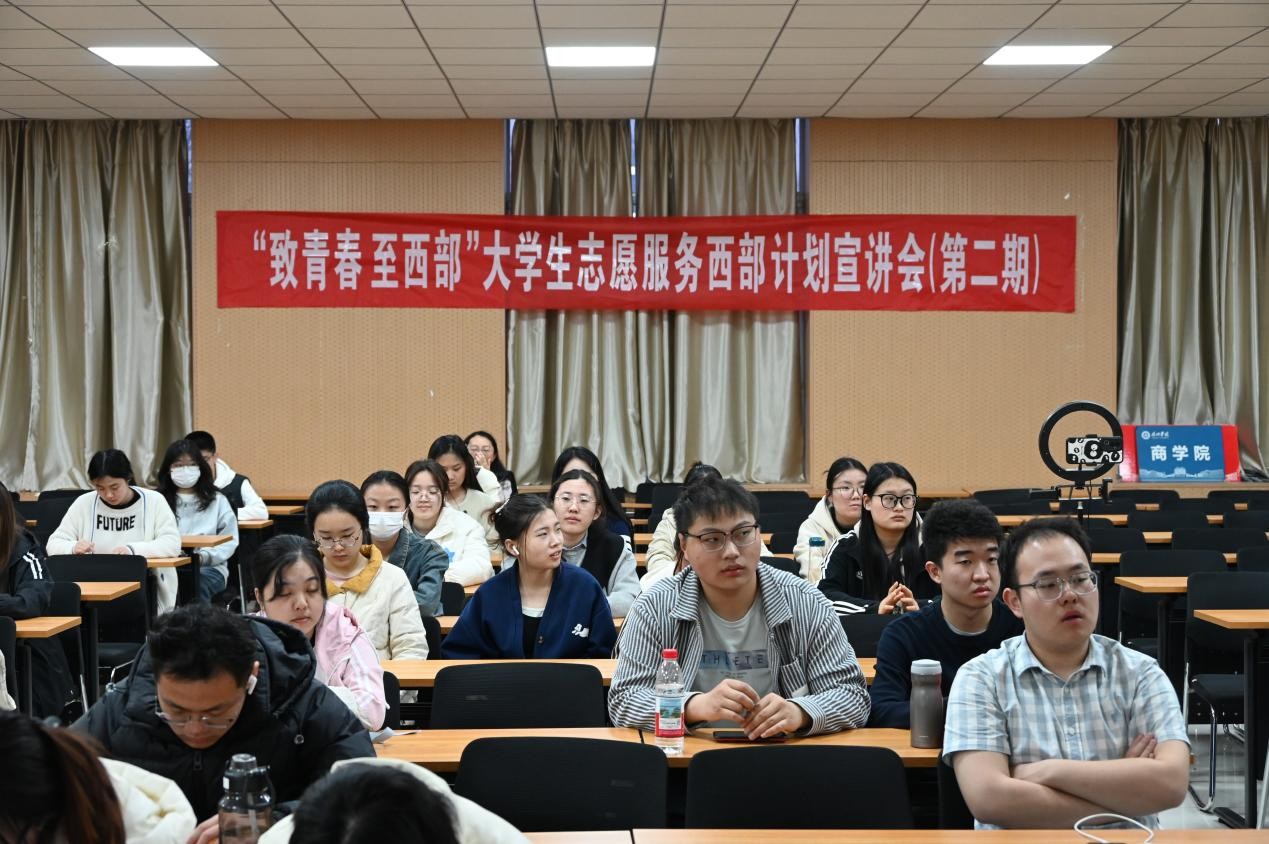 为深入贯彻习近平总书记关于新时代推进西部建设的重要指示精神,激励我校有志青年投身西部、奉献基层,弘扬“奉献、友爱、互助、进步”的志愿服务精神,帮助青年学子深入了解西部计划政策,2025年3月24日晚,а 天堂 在线团委承办“致青春 至西部”大学生志愿服务西部计划宣讲会(第二期)。